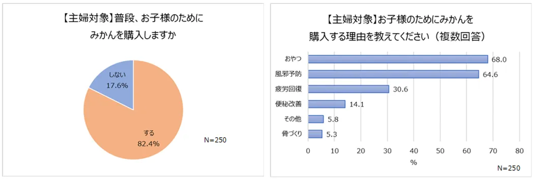 みかんが好きという人が多かった割には、自分自身では購入する割合が低いという結果が出ましたが、専業主婦を対象にした場合はどうなのでしょうか。子どものためにみかんを購入するかどうかを質問しました。購入すると回答した人が82.4%と高い割合を占めました。また、みかんを購入する理由を聞いたところ、最も多い回答だったのが「おやつ(68.0%)」、2番目に多かったのは、「風邪予防(64.6%)」という結果でした。手軽に食べられて風邪予防にもなるみかんは、主婦にとって子どものおやつとしては理想的かもしれません。
