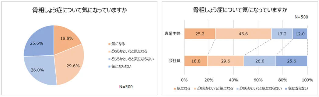 専業主婦を対象として比較した場合には、「気になる(25.2%)」「どちらかというと気になる(45.6%)」の割合が、会社員を上回る結果となりました。専業主婦は、食事における家族の健康を気にする機会が多いことから、会社員よりも骨粗しょう症へ意識が高いという結果が出たと考えられます。