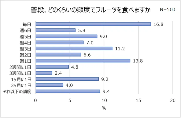 美味しいだけでなく健康促進につながるフルーツは、どのくらいの頻度で食べられているのでしょうか。頻度について質問。最も大きな割合を占めたのが「毎日(16.8%)」、続いて多かったのは、「週1日(13.8%)」でした。約半数の人が週に3日以上はフルーツを摂っているということが分かりました。逆に13.4%の人は、3ヶ月に1日以下の頻度でしかフルーツを食べていないことが明らかに。
