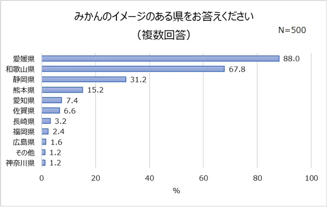 みかんのイメージのある県について回答してもらいました。結果は「愛媛県」と回答した人が88.0%と最多。「和歌山県(67.8%)」「静岡県(31.2%)」が続きました。生産量だけでなく、空港や学校の蛇口からみかんジュースが出るなどといったエピソードを持つ「愛媛県」が1位という結果になりました。1~3位を見てみると、生産量や消費量の多い県が上位にくるという結果になりました。