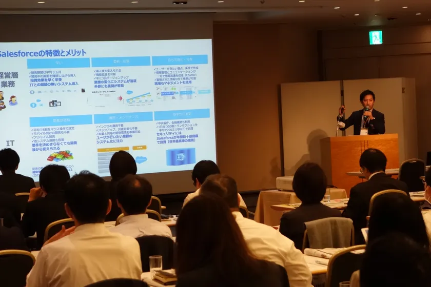 当社のセッションでは、株式会社セールスフォース・ドットコムと共同で、営業現場の可視化で実現する「金融業界におけるフィールドセールス革命」についての講演を行いました。