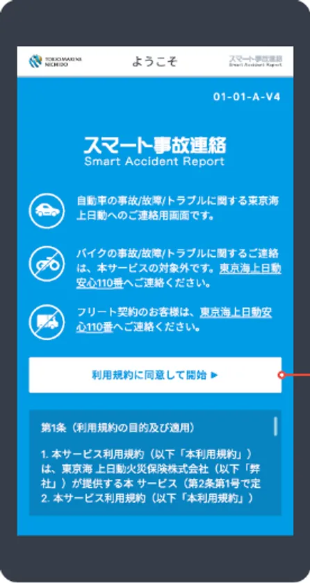 お客様が自動車事故に遭遇された際に、スマートフォンやパソコン等のWeb上で事故の連絡を簡単・スムーズに行うことができる機能です。特徴的な機能として、Web上の入力画面の途中から、お客様のニーズやその時の状況により、電話連絡に切り替えられる機能を導入いたしました。また、事故の受付のみならずロードサービス(レッカー等)の手配も可能です。この仕組みは、2018年より当社が資本業務提携している米メトロマイル社(※1)が持つインシュアテック技術を活用しております。