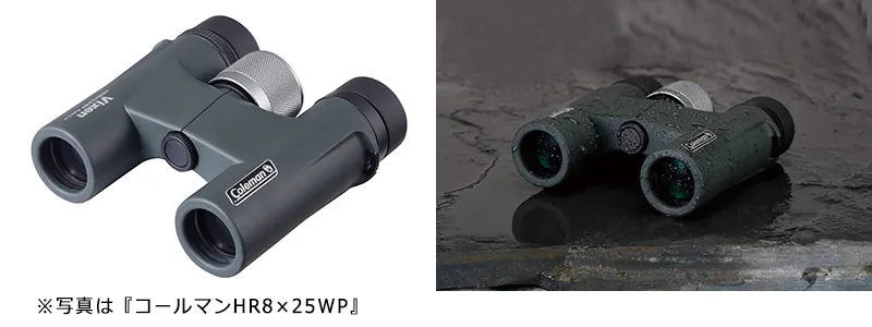 コールマン×ビクセンのコラボレーションシリーズに、対物レンズ有効径25mmの新型コンパクトモデルが登場。倍率は8倍(HR8×25WP)と、10倍(HR10×25WP)の2機種をご用意。傷がつきにくいラバー外装、窒素ガス充填による防水設計で、キャンプ、トレッキング、野外コンサート、スポーツ観戦など、幅広いアウトドアシーンにおすすめです。