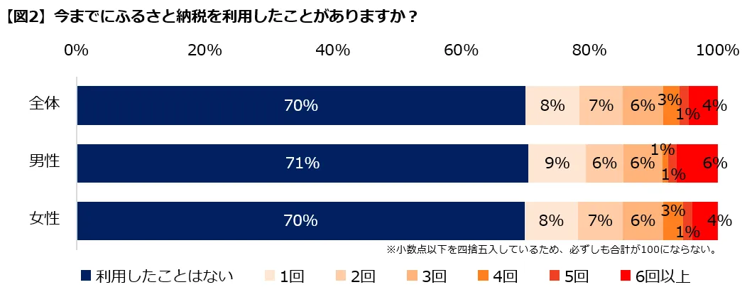 「今までにふるさと納税を利用したことがありますか?」と尋ねると、3割が「利用したことがある」と回答。男女別に見ると、男性のほうが女性よりも、6回以上利用している方の割合が高い結果となりました。