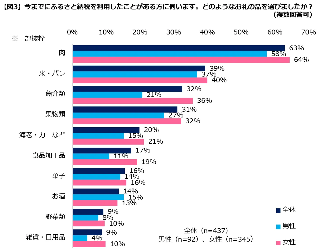 2:返礼品で最も人気の品は「肉」。女性には「魚介類」、「食品加工品」が人気。(図3)
