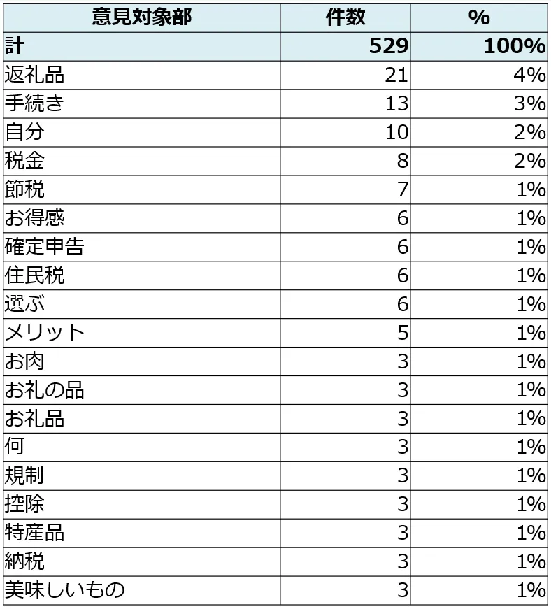 「ふるさと納税を利用して感じたこと」について回答者の声を分析したところ、「返礼品」、「手続き」、「自分」、「税金関連」、「お得感、メリット」、「選ぶ」といった内容が目立ちました。