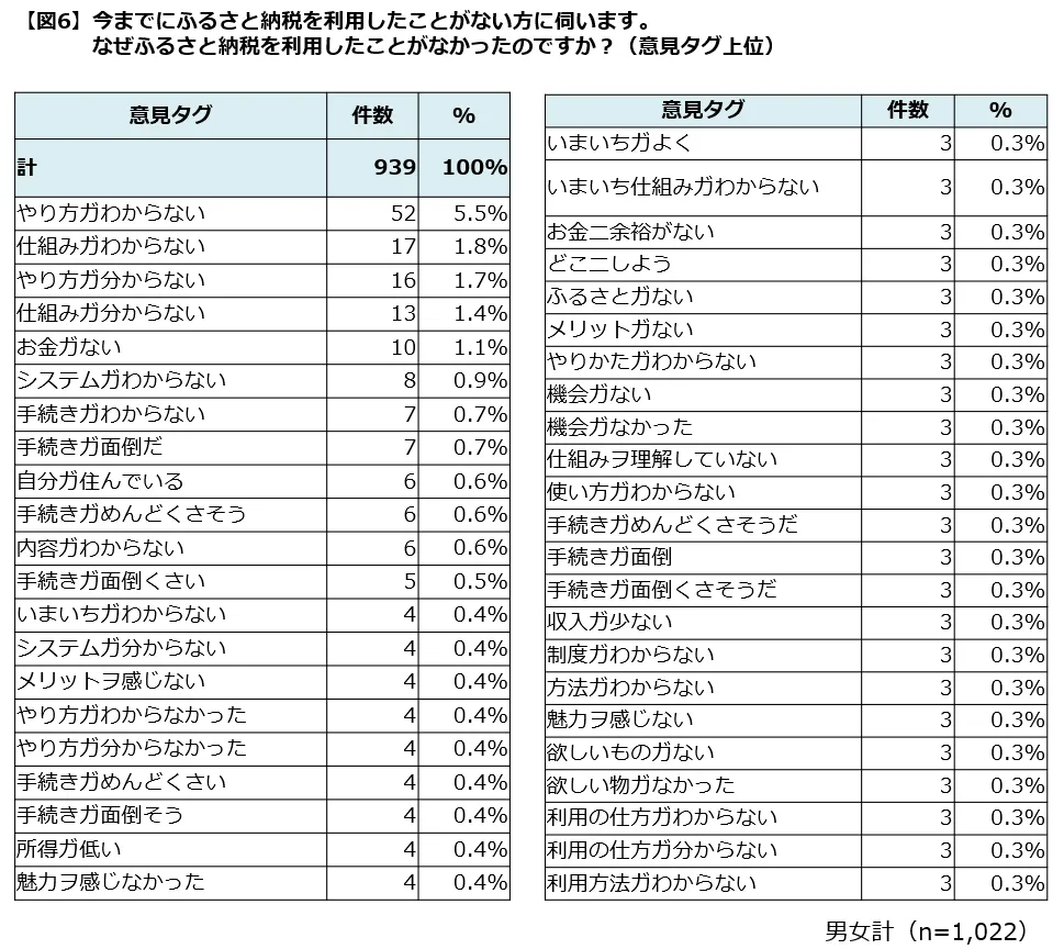 今までにふるさと納税を利用したことがない方に、「なぜふるさと納税を利用したことがなかったのか」を伺い、回答者の声を分析しました。すると、「やり方が分からない」、「仕組みが分からない」、「手続きが面倒」、「欲しい物がない」といった理由が大半を占めました。