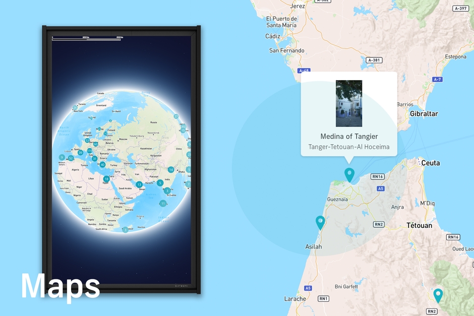 窓の向こう側、宇宙に浮かぶ地球が象徴的な進化した「地図」では、ズームインをしていくことで特定のエリアに焦点を当てていくことができます。ビデオグラファー達が撮影した地域はピン留めがされており、そこから風景を選ぶことができます。気軽には行けない秘境の場所を探してみたり、ビデオグラファーの旅路を想像してたどってみたりと、世界中を存分に探索してみませんか。