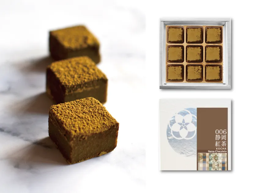 香りの良さと濃厚さを感じていただくために試行錯誤を重ね、使用している紅茶パウダーの量は(一般的な市販の紅茶生チョコに使用する量の)約1.5倍。濃厚な味わいでありながら、食べ終えた後に重さはなく、すっきりとしているのは「和紅茶」を使用しているからこそ。職人の手でひとつひとつ丁寧に作られ、口どけは非常になめらか。