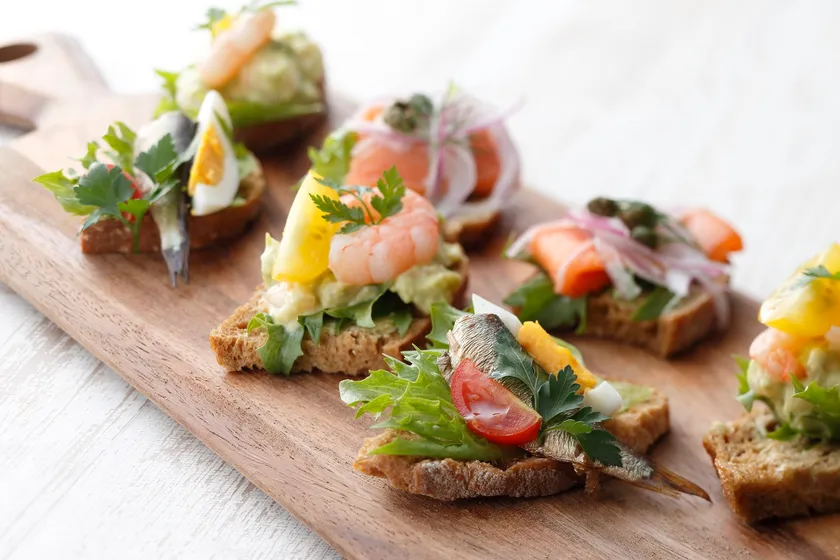デンマーク発祥のオープンサンド。えび+アボカドやサーモンなど、彩り華やかな3種類をご用意。