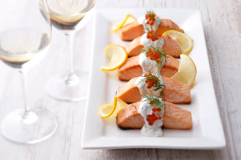 バターでふっくらとソテーしたサーモンに、いくらを混ぜ込んだヨーグルトのソースでさっぱりと。相性の良いディルがほんのりと香ります。