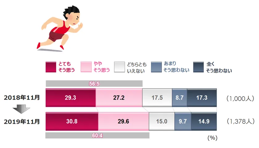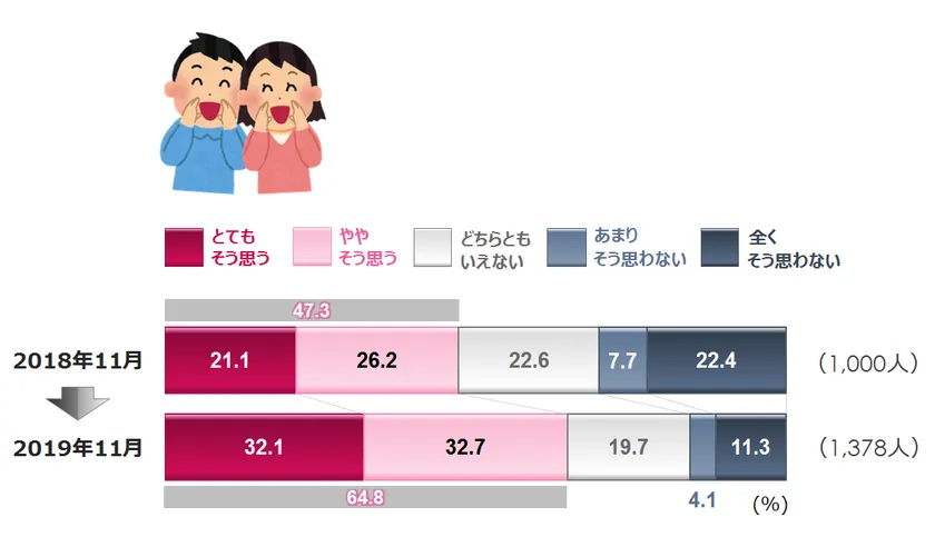 「とてもそう思う」と「ややそう思う」を合わせた比率でみると、2018年が33.8%→2019年が38.7%となり、約5ポイントのアップでした。