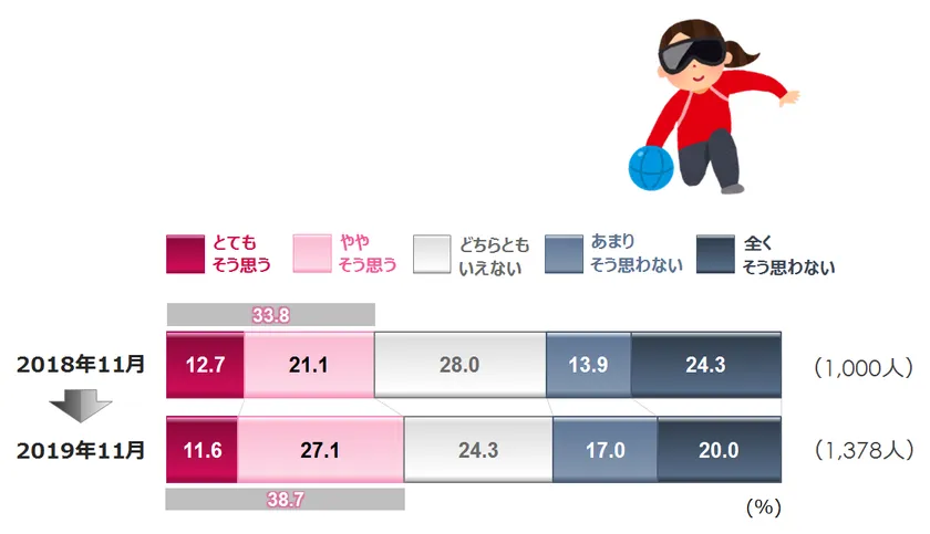 パラリンピックの観戦意向については、「とてもそう思う」は2018年12.7%→2019年11.6%と微減でしたが、「ややそう思う」は2018年21.1%→2019年27.1%と6ポイント増加しました。