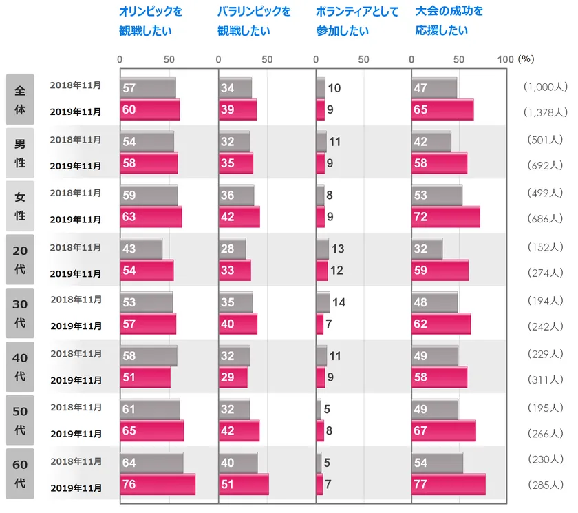 この1年間で人々の関心や期待感が高まり、大会の成功を応援する声も強くなってきているのでしょう。2019年11月時点で6割強の数字が、来年の開催前にはどのように変化するか、続けてウォッチングしていきたいと思います。