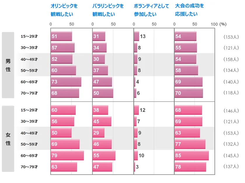 また、大会の成功を応援するは、20代(27ポイント)と60代(23ポイント)の増加が目立ちました。