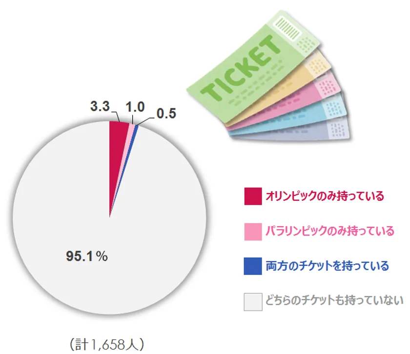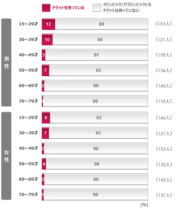 チケットをお持ちかどうかを質問したところ、オリンピックとパラリンピックのいずれかを保有していると回答した人は、15-79才男女全体(1,658人)のうち、5%程度でした。