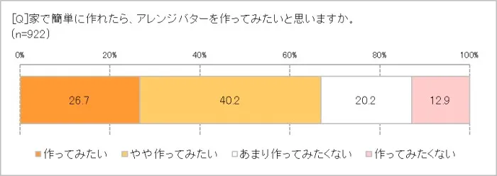 興味と関心が寄せられている「アレンジバター」、その材料はバターと、フルーツやナッツなどの食材。「だったら自分で作れるんじゃないかな」と思うのは当然でしょう。「家で簡単に作れたら、アレンジバターを作ってみたいと思いますか?」という質問には「作ってみたい」という人が66.9%(「作ってみたい」26.7%+「やや作ってみたい」40.2%)でした。