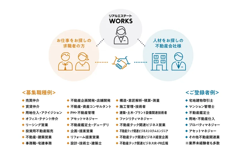現在、「リアルエステートWORKS」では不動産業界に就職を希望される求職者様に、人材をお探しの不動産業界の企業様を紹介しております。求職者様は「リアルエステートWORKS」の利用ユーザーとして無料で就職相談や求人紹介を受けることができます。現在は、主に以下の職職種の募集をサポートしています。