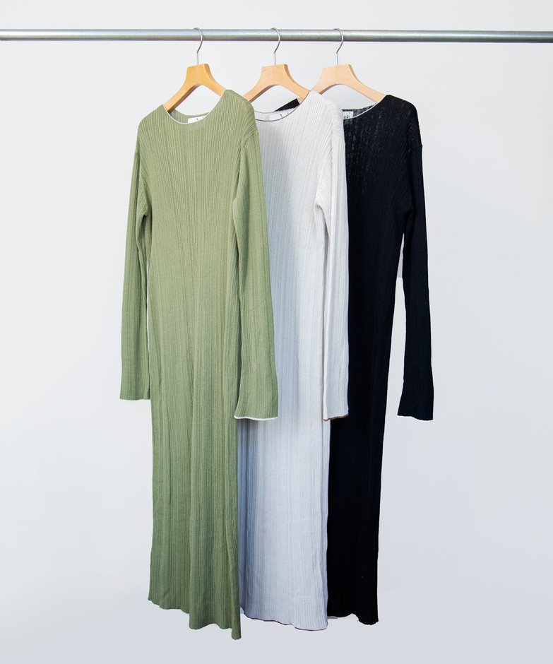 レイヤードを楽しみたいリブドレス。透け感を出すために糸をランダムなリブ編みに。コンサバティブになりすぎないよう首、袖、裾に配色を取り入れ、カジュアル感をプラス。タイトなシルエットなのでオーバーサイズのアウターとも好相性。