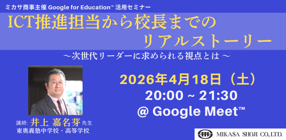 ミカサ商事株式会社(本社:大阪府、代表取締役:中西 日出喜、以下ミカサ商事)は、教職員向けICT活用セミナー ICT推進担当から校長までのリアルストーリー 〜次世代リーダーに求められる視点とは 〜を、2026年4月18日(土)にオンライン開催いたします。