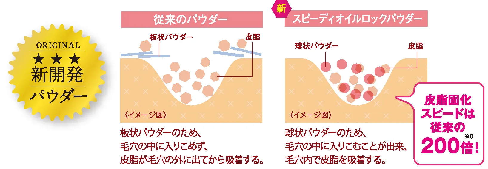 皮脂を固化させる独自の新原料「スピーディオイルロックパウダー*5」を配合!従来品に配合されている皮脂吸着パウダーの200倍*6のスピードで皮脂を吸着します。