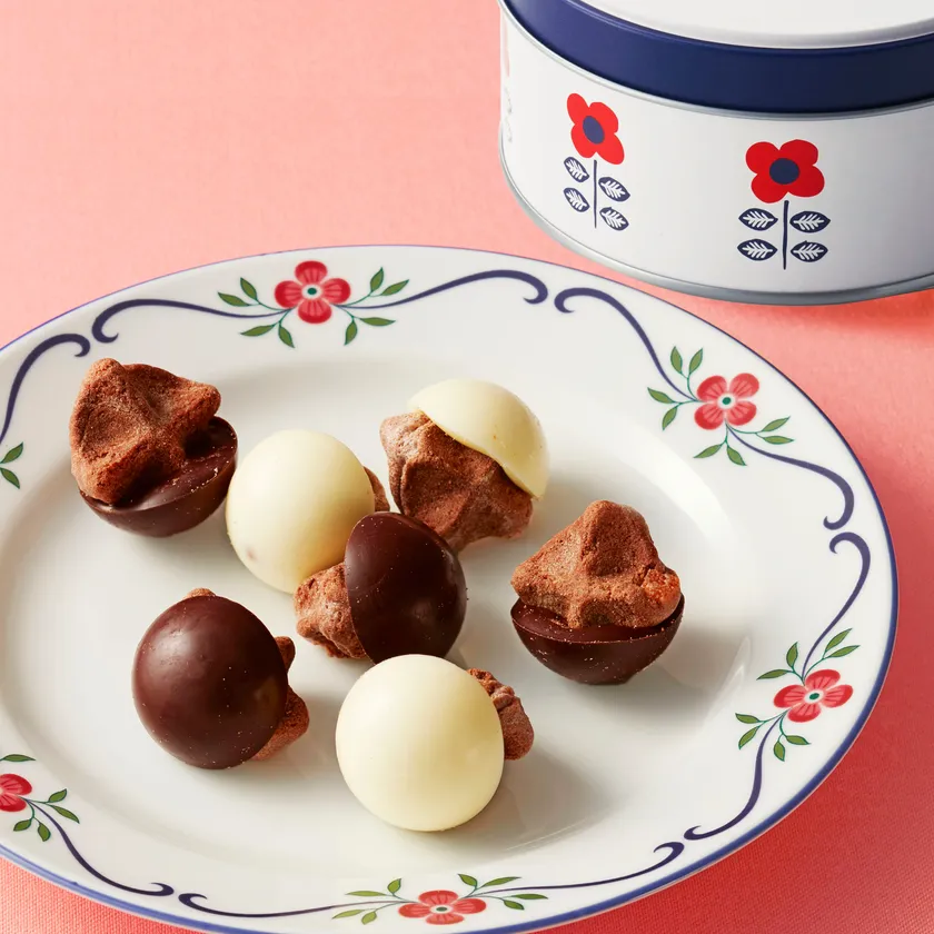 中には「チョココロ」が2種類入っています。ほろ苦いオレンジピール入りのショコラ味のコロコロワッフルにはスイートチョコ。甘い香り広がるキャラメル味のコロコロワッフルにはホワイトチョコを合わせた、見た目も愛らしいひとくちサイズのチョコスイーツです。