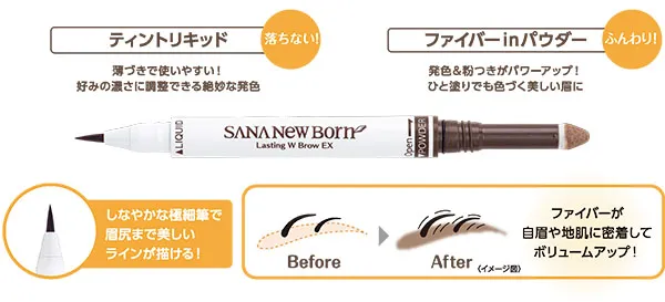 「サナ ニューボーン ラスティングWブロウEX N」は、リキッドとパウダーを組み合わせた、シリーズ最強のラスティング力で1日中落ちない ふんわり美眉をキープするアイブロウです。薄づきで重ねてもキレイに発色するティントリキッドと、ひと塗りでも色づくファイバーinパウダーで簡単に立体感のある眉に仕上げます。