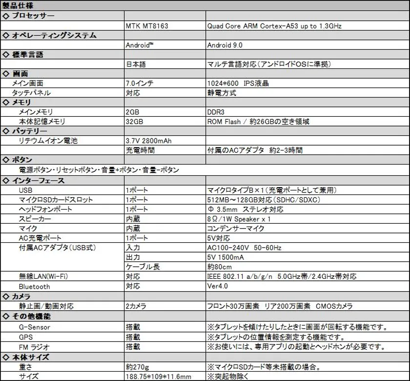 このタブレットは、クアッドコアのプロセッサーを搭載し、メインメモリに2GB、記憶メモリとして32GBのフラッシュROMを搭載しています。Bluetooth(R)にも対応しているため、入力機器やヘッドフォンなどを無線でお使いいただくことも可能です。無線LAN機能は5.0GHz帯と2.4GHz帯の両方に対応し、Gセンサー、GPSなど必要な機能も網羅しております。また、FMラジオのチューナーを搭載しているため、災害時にはFMラジオとして、無線LAN(Wi-Fi)局が復旧後は通常のタブレットとして使うことができ、もしもの時にもFMラジオによる情報収集が可能です。