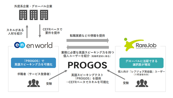 人にまつわるデータを活用し、グローバルに活躍する人々を生み出す株式会社レアジョブ(以下、レアジョブ社)と、その法人向け事業子会社、株式会社プロゴス(以下、プロゴス社)は、グローバル人材に特化した人材紹介会社エンワールド・ジャパン株式会社(以下、エンワールド・ジャパン社)と提携し、英語スピーキング力の可視化・定量化と、外資系・日系グローバル企業への人材紹介を連動させる取り組みの基本合意を締結いたしました。