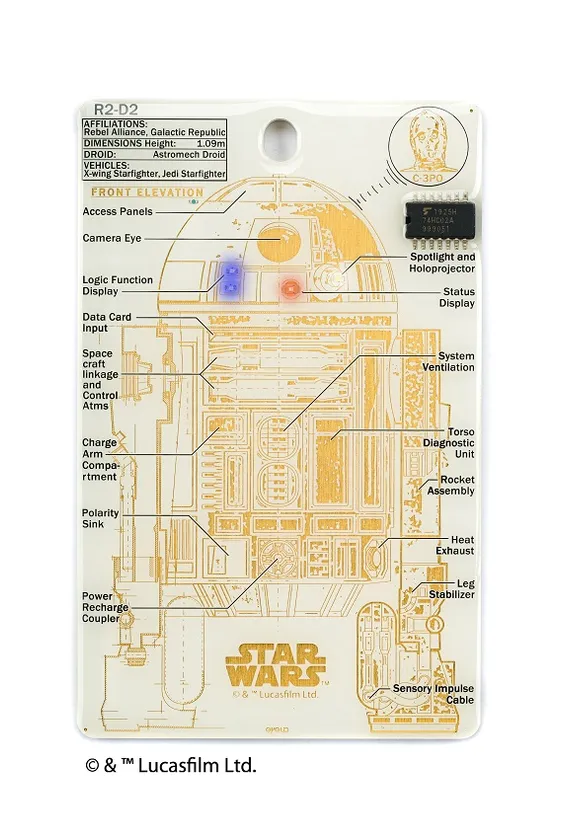 FLASH R2-D2(TM) 基板アート ICカードケースは、改札のタッチやICカードでの決済時に電池無しでLEDが光るギミック付きです(※1)。