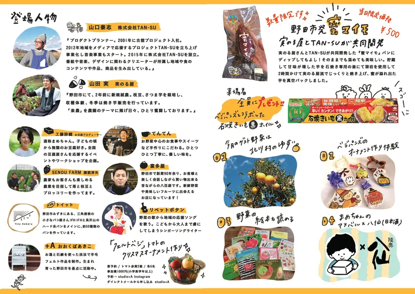 TAN-SUが拠点を置く野田市内の古民家工房にて、地元の若手農家さんや飲食店さんたちと一緒に野菜や果物を楽しむ八百屋さん企画です。野菜を買って、食べて、学べる楽しい一日をご案内いたします。当日は焼き芋農家さんと共同開発したオリジナル商品の販売や、焼き芋作り体験、お豆腐おでんバル、音楽ライブやワークショップなど楽しい企画が盛りだくさん。