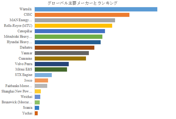 LP Informationのトップ企業研究センターによると、船舶用船内機(5MW未満)の世界的な主要製造業者には、Wärtsilä 、CSSC、MAN Energy Solutions、Rolls-Royce (MTU)、Caterpillar 、Mitsubishi Heavy Industries、Daihatsu、Hyundai Heavy Industries (HiMSEN)、Yanmar、Cummins などが含まれている。2024年、世界のトップ10企業は売上の観点から約70.0%の市場シェアを持っていた。