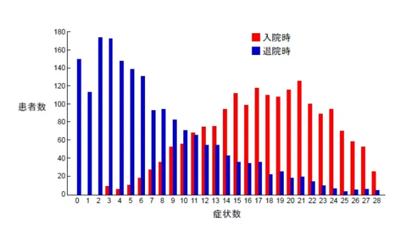 全患者の愁訴数は、入院時は17.8±5.7(平均±標準偏差)でしたが、退院時には7.4±6.0にまで減少しました(P<0.0001)。入院時に10以上の愁訴を訴える患者数は91.1%に上りましたが、退院時には29.3%にまで減少しました。更に、8.2%の患者は退院時には全くの無症状(愁訴数ゼロ)にまで回復しました(図1)。