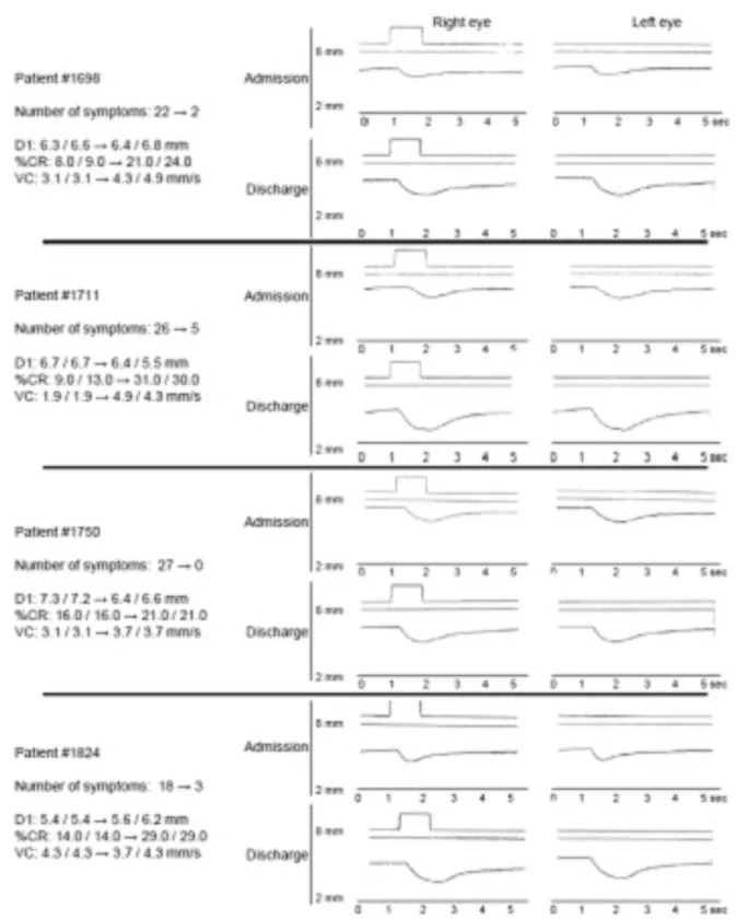 すべての著明改善症例(n=4)において、光刺激前の瞳孔の直径(D1)、刺激後の収縮率(%CR)、収縮速度(VC)のすべての指標が改善している。
