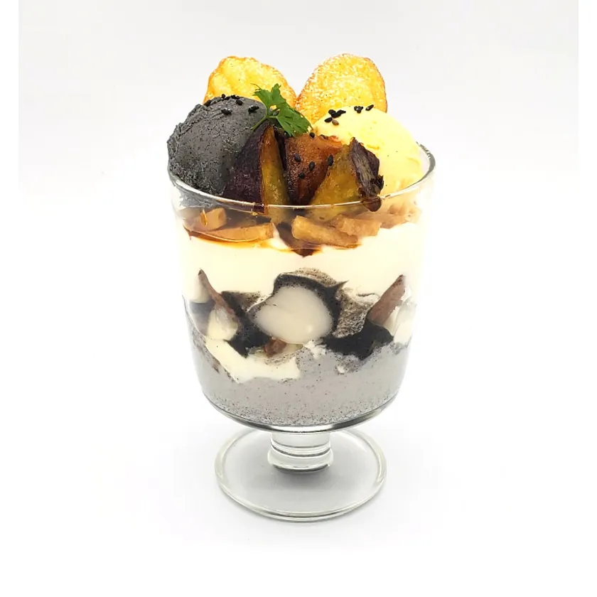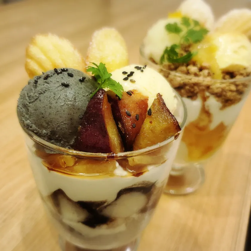 季節限定マドレーヌ「黒ごま」と、濃厚な自家製黒ごまアイス、滑らかなくちどけの黒ごまプリンなど、黒ごま尽くしのパフェ。ごま好きにはたまりません。もちもちの白玉、かりかりの芋けんぴなど、食感の違いも楽しい一品です。