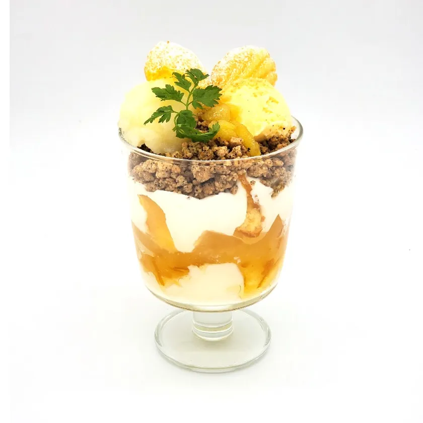 期間限定「白みそゆず」のマドレーヌをはじめ、ゆずゼリー、白みそクランブル、レモンソルベ、ブランマンジェなど、甘酸っぱさと上品な塩気が絶妙なバランスを奏でます。和食では定番の組み合わせも、マドレーヌやパフェで表現するとユニークな印象。お好みで別添えした白みつジンジャーソースをかけてお召し上がりください。