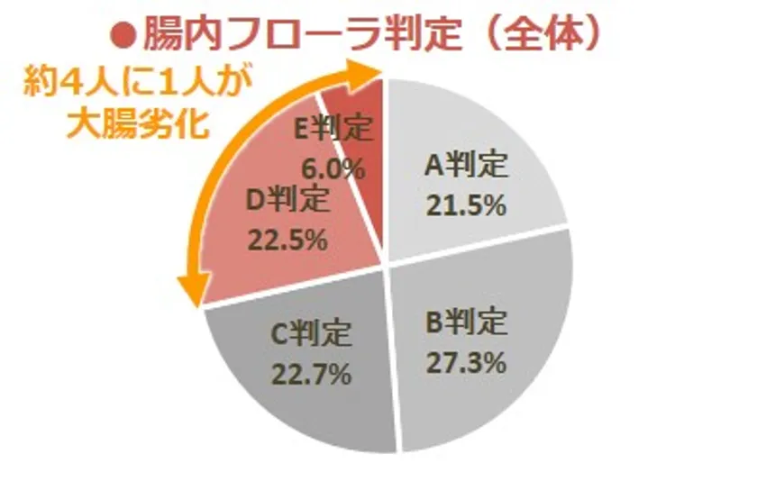 腸内フローラの状態をスコア化してみると、最も良い「A」~最も悪い「E」のうち、腸内フローラのバランスが乱れている傾向にあるD、E判定をあわせると、約4人に1人で大腸劣化の可能性が疑われました。また、男女別では、女性よりも男性、年代別では意外にも20歳代の若年層、そして40歳代以降になるにつれて、大腸劣化が進む傾向がわかりました。20歳代は、社会人として自立し自由な時間が多いがゆえに、食生活や生活習慣が乱れる傾向にあることが伺えます。30歳代になると、健康意識が高まる傾向にありますが、40歳代以降は健康意識が高まっていても、年齢と共に臓器の衰えが生じてしまいます。自ら検査キットを使用する意識の高い人でさえこのような結果であることから、実際にはさらに多くの人が大腸劣化の危機に直面しているかもしれません。