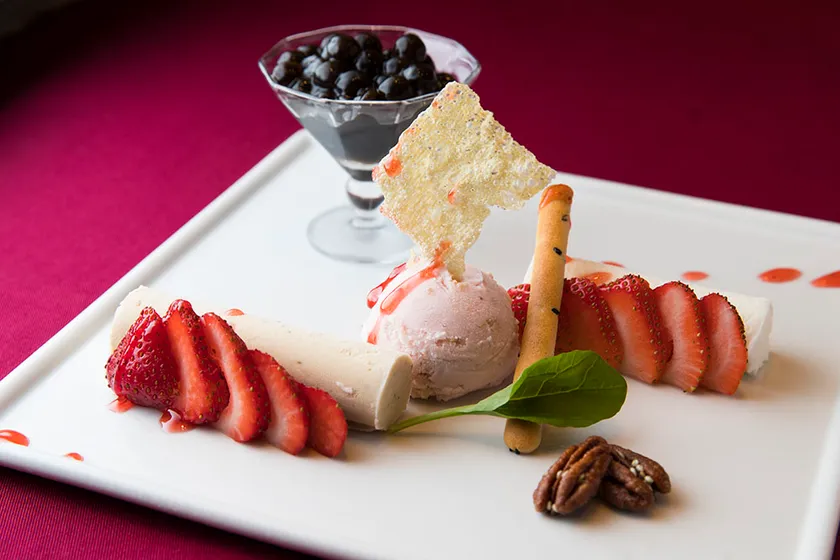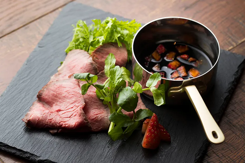 国産牛モモ肉のローストビーフと栃木県産いちごをあわせました。バルサミコソースといちごを組み合わせることで、酸味と甘みが肉の旨味をより引き立てます。