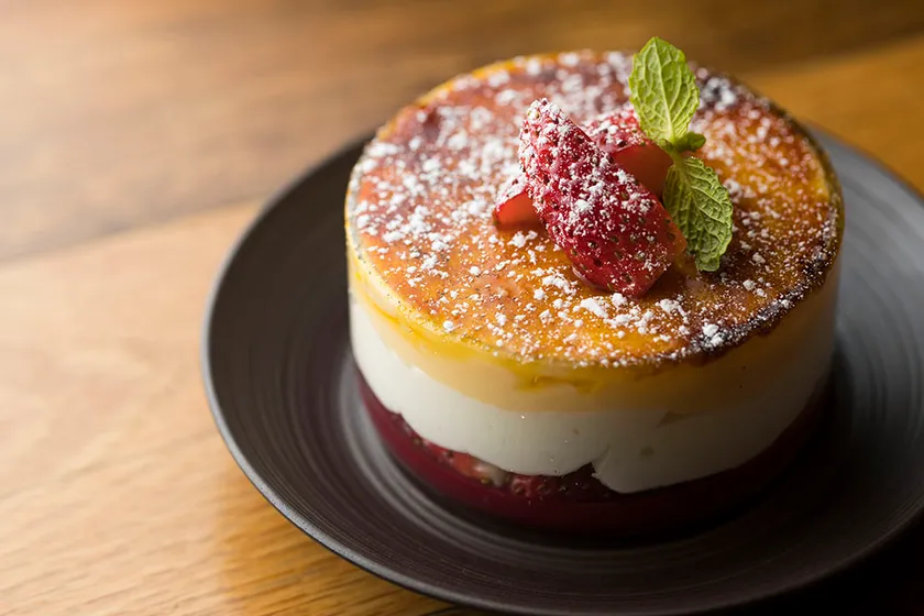 スペインの伝統菓子クレマカタラーナ(クレームブリュレの原形)を、フレッシュな苺とフランボワーズのジュレでアレンジしました。