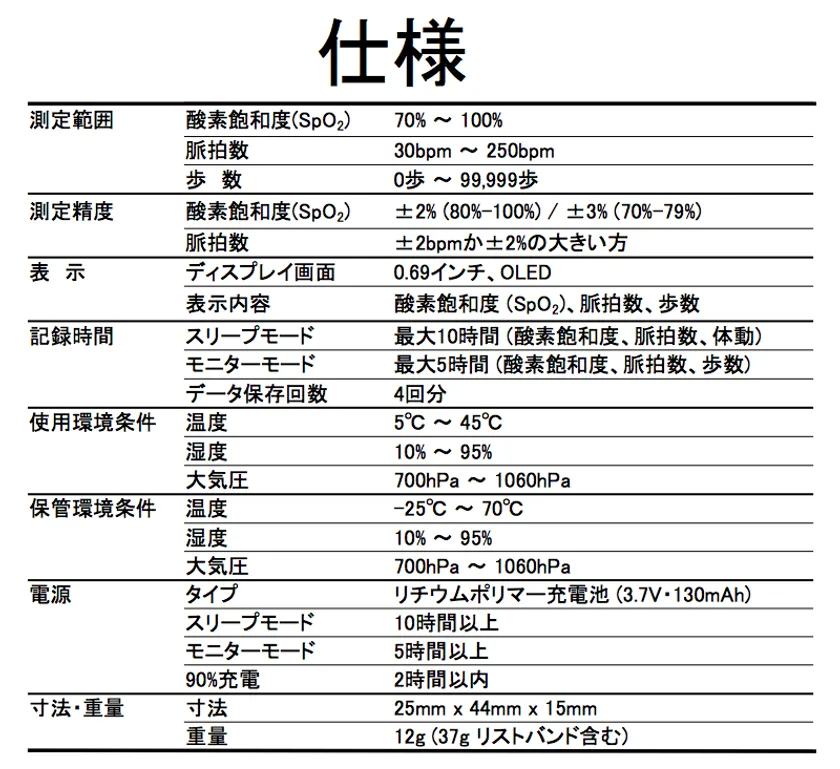 通常、指先で測定している血液中の酸素飽和度を指の根元で測定できます。センサーが外れにくく、圧迫感がなく、指先が自由になるだけでなく、小型で軽量な装置なため、長時間測定する運動、日常生活、睡眠の場面での測定に適しています。睡眠時無呼吸症候群、在宅酸素療法、医療現場などで使用されています。スマートフォンアプリから持続的に酸素飽和度値を表示でき、継続的なモニタリングが可能です。