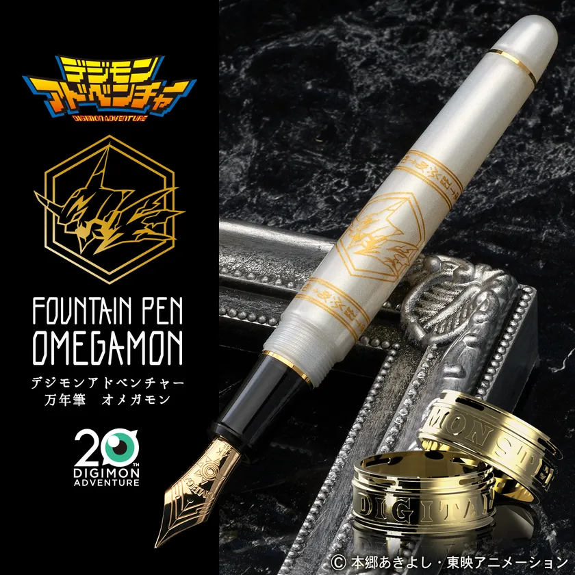 本商品は、アニメ「デジモンアドベンチャー」の“オメガモン”をモチーフにし、筆記具メーカー「プラチナ万年筆」とコラボした特別仕様の万年筆です。創業から約一世紀の歴史を持ち長年培われたプラチナ万年筆の高い技術が注ぎ込まれています。