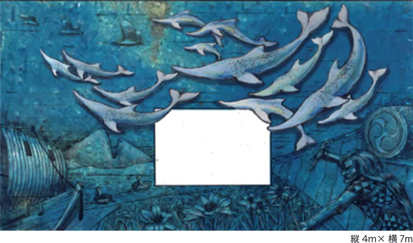日本交通文化協会として543作品目となる本作品は、佐渡出身、東京藝術大学名誉教授で世界的な金工作家である宮田亮平氏が原画・監修を務め、金属で制作したイルカは同氏が自ら手がけています。陶板に描かれた風情は古くからの伝統芸能の鬼太鼓や、観光客らに人気の名物のたらい舟、海運業の中心となった北前船、歴史的価値の高い佐渡金山、日本を象徴する鳥と称されるトキ、美しい自然風景など、佐渡の文化、歴史そして自然を最大限に表現しています。その佐渡を優雅に泳ぐイルカの群れ。『藝大受験のため佐渡汽船に乗り、佐渡島から新潟に向かうときに見たイルカの姿に魅かれたことが芸術家としての「原点」』と語る同氏が表現したイルカは、佐渡へ訪れた人々を温かく出迎え、旅立つ人々に元気や勇気を与える、まるで応援団かのように、佐渡の島、そして島とつながる人々を見守りながら泳ぎ続けています。