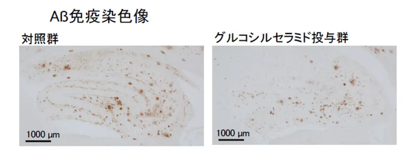 <アミロイドβペプチド斑の減少>※グルコシルセラミド投与群では、発症原因の一つとされるアミロイドβペプチドが減少していることが確認された
