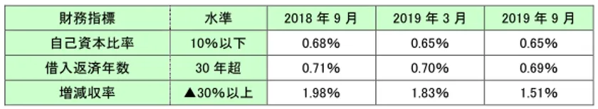 経済環境や景気動向の変化により、倒産のトレンドは常に変化しております。下表のとおり、2018年9月から2019年9月の1年間で比較しても、各財務指標における要警戒領域の倒産確率も変化が生じていることが分かります。これらの倒産トレンドの変化に対応するために、定期的に倒産実績の集計を行い、RM格付と倒産確率の乖離が生じないように調整を行っております。