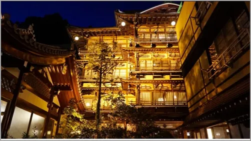 1758年創業の渋温泉にある老舗旅館。1936年に完成した建物を現在もそのまま旅館として使用しており、金具屋の建物のひとつである「木造四階建 斉月楼」と「金具屋大広間」は平成15年(2003年)に国の登録有形文化財に認定されました。8つの浴場で、源泉100%掛け流しの温泉を楽しむことができます。ジブリ『千と千尋の神隠し』に描かれた湯屋のモデルとも言われ、アニメ『このはな綺譚』の舞台にもなった、趣深い宿泊施設です。