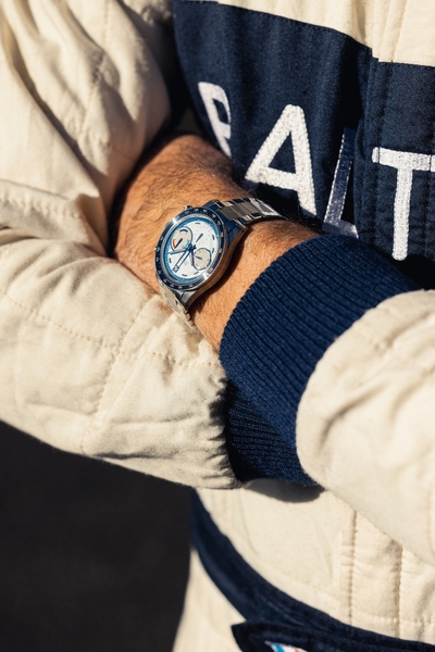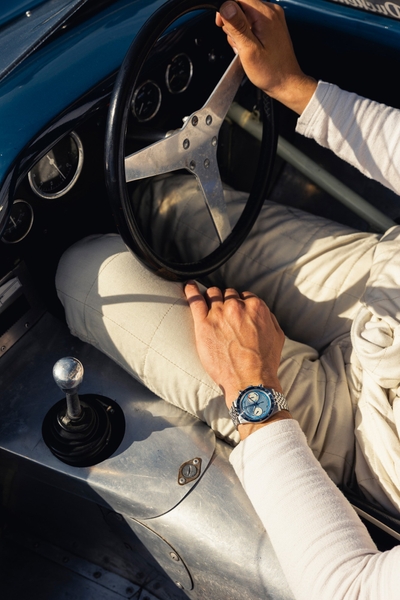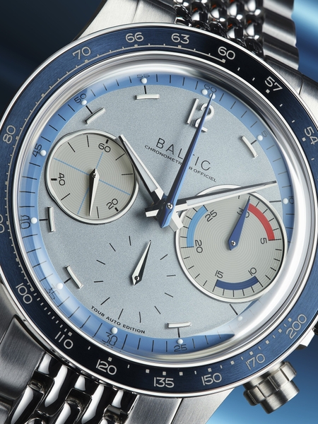 モータースポーツの歴史を反映したディテールを特徴とします。特に「ビッグアイ」レイアウトは、1970年代のレーシングクロノグラフに見られる視認性を重視したデザインで、レース中でも計時を容易にします。さらに、ツール・ド・フランス・オートモービルのオリジナルカラーに敬意を表し、ダイヤルにはさまざまなブルートーンを採用しました。ルミノバのドットに合わせて、文字盤に円を描くインデックスラインを追加しました。これにより、デザインがより洗練された印象になっています。本モデルのダイヤルカラーは、BALTICレーシングチームのクラシックカーのカラーリングにインスパイアされており、ブルートーンとカウンターの配色がそのエッセンスを反映しています。このデザインは、ブランドのレーシングスピリットを象徴し、時計とクラシックカーが一体となる特別なコレクションとなっています。