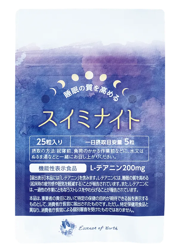 ◆ 「エッセンスオブノース スイミナイト」は睡眠の質を高め(起床時の疲労感や眠気を軽減する)、一過性の作業にともなうストレスをやわらげる、L-テアニンが含まれております。