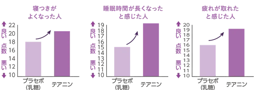 L-テアニンには、睡眠の質を高める(起床時の疲労感や眠気を軽減する)ことが報告されています。また、L-テアニンには、一過性の作業にともなうストレスをやわらげることが報告されています。