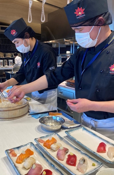 今回、運営したのは「すし研究部」。これまで培ってきた技術をお客様の目の前で丁寧な手つきで準備。