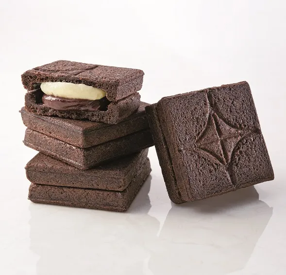 2種類のココアパウダーを練り込んだクッキーにバタークリームと、ラム酒で香づけしたチョコレートキャラメルの2層を挟んでいます。